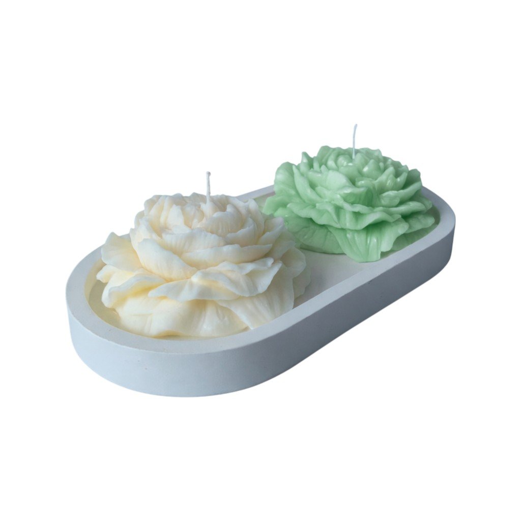 El conjunto incluye dos flores en tonos combinables —una en color marfil y otra en colores suaves como amarillo, verde, azul, rojo o lila— colocadas sobre una bandeja minimalista que realza su diseño. Perfectas para decorar salas, dormitorios, baños o espacios de relajación, estas velas aportan un toque de serenidad y estilo sin esfuerzo.